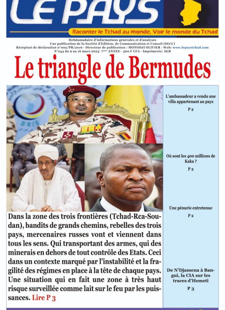 Une La Une de votre hebdomadaire n°244 paru ce jeudi 09 mars 2023 9 mars 202305415 Au Menu: L’ambassadeur a vendu une villa appartenat à l’Etat, p 2 Où sont les 400 millions de Kaka, p 2 Une pénurie entretenue, P2 De N’Djaména à Bangui, la CIA sur les traces d’ Hemeti, p 3 Le ridicule de la Pax Koulamallah Previous Post Le Tchad accueille la 7ème et la 2ème réunion du comité de pilotage du Presibalt et le Parsebalt Next Post Articles liés Revue Revue de presse de la semaine du 06 au 12 mai 2019 13 mai 201903668 Economie Faire du bassin du lac Tchad une terre de paix et d’abondance 16 mai 201704254 Education L’Atedi va en guerre contre les sévices corporels en milieu scolaire 18 novembre 201704874