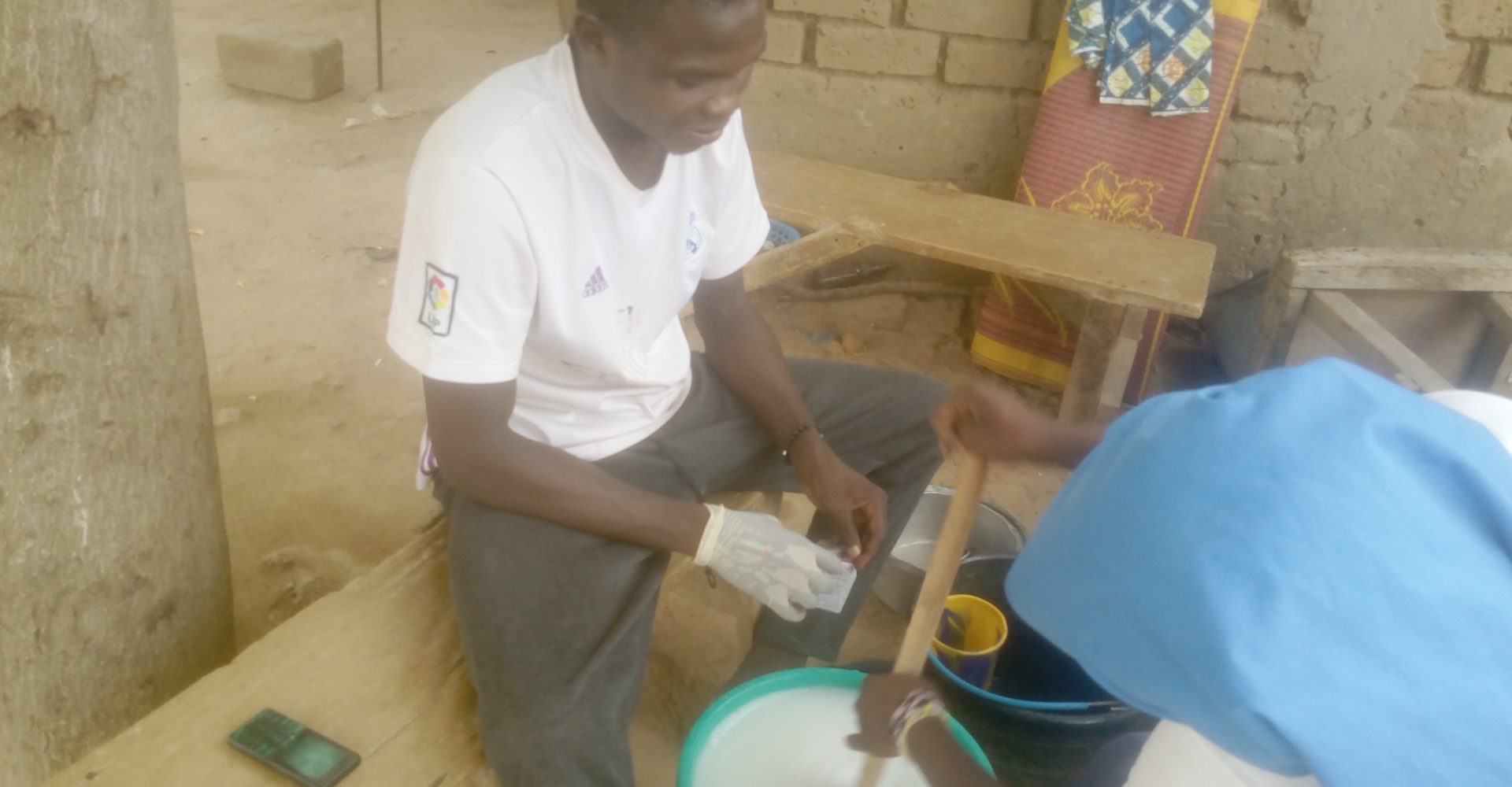 Assis sur un banc avec sa sœur Adama sous un arbre dans la concession familiale, tous deux habiller en blanc et muni des sceaux d’eau, d’un tourne boule, d’un gobelet et un panier contenant des produits, comme matériel de travail, Stéphane prêt a lancé le processus de fabrication de ses détergents liquides qu’il nous définit comme produit de synthèse ayant une propriété